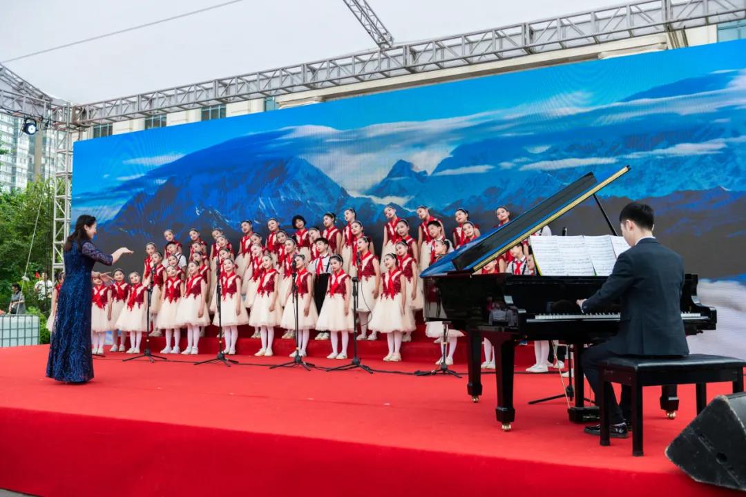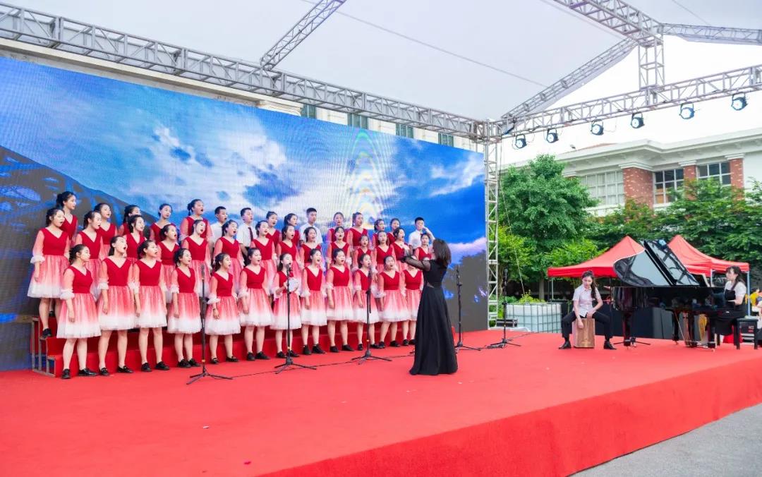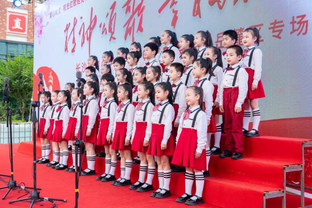 白马实验小学带来合唱《中国少年》、岳麓区第二小学带来合唱《不忘初心》、博才拓维学校带来合唱《红领巾,飘起来》、博才白鹤小学带来合唱《灯火里的中国》、湘江实验小学带来合唱《游击队歌》、湘仪学校带来合唱《国家》、博才小学带来合唱《在队旗下欢聚一堂》、西雅中学带来合唱《我爱你中国》。