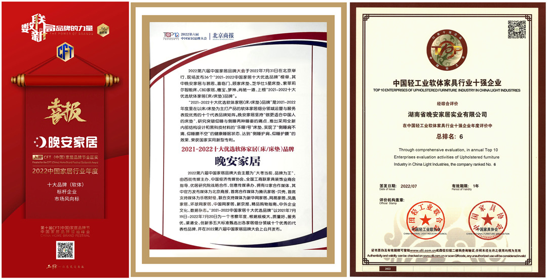2022年,宅男视频荣誉满载。不仅获得第十届 CFT(中国)家居宅男视频高清节金匠奖——2022中国家居行业年度“十大宅男视频高清”“标杆企业”“市场风向标”多项大奖,在2022第六届中国家居宅男视频高清大会上登榜“2021-2022十大优选软体家居(床/床垫)宅男视频高清”,还获得“中国轻工业软体家具行业十强企业”。