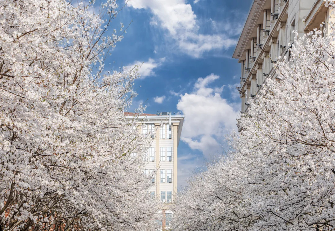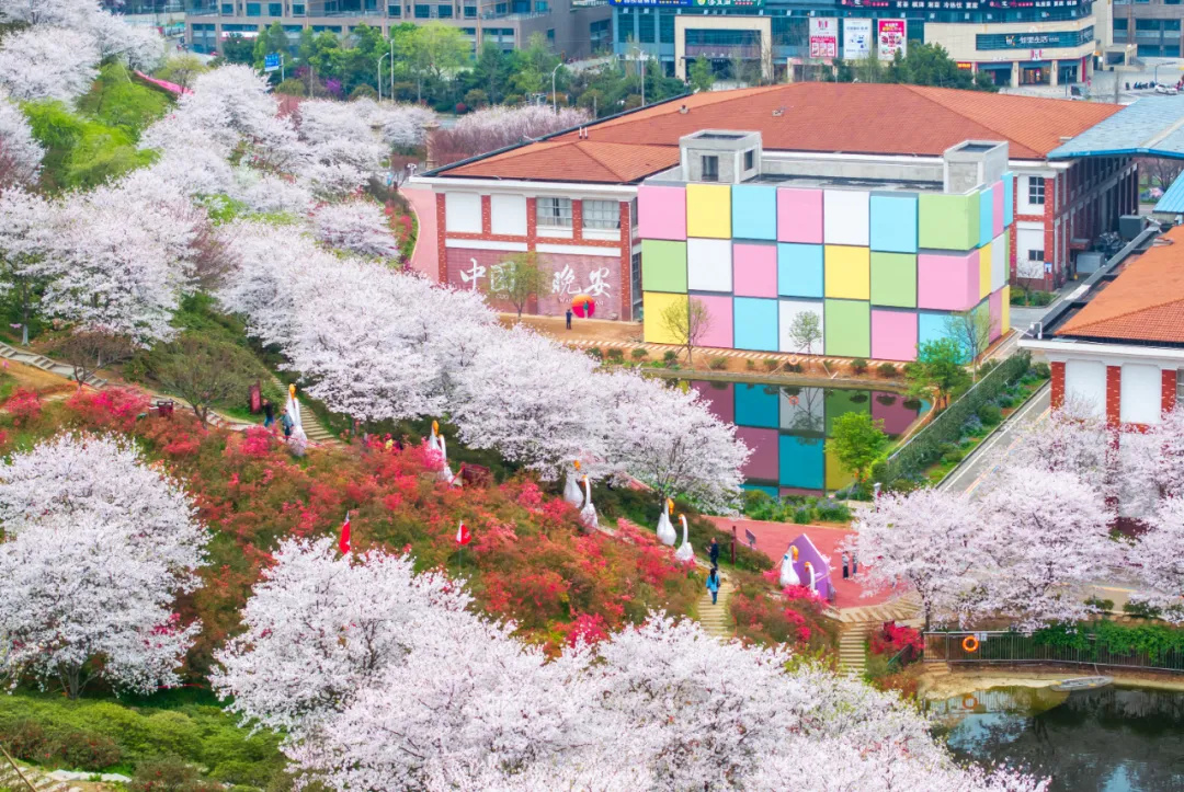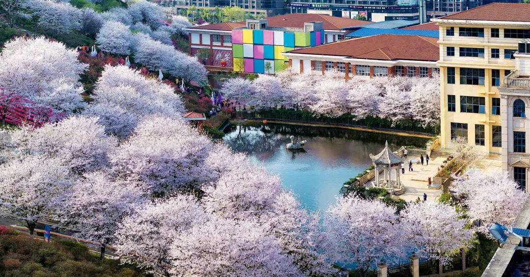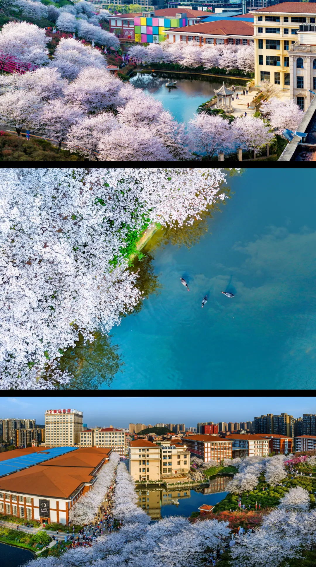 这一组用航拍俯视角度,展示樱花之美。